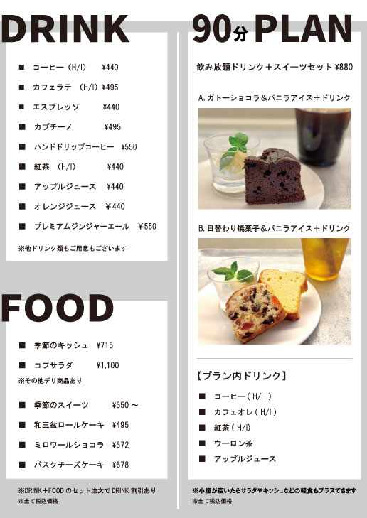ドリンクORフードのみの単品オーダーでのご利用、ドリンクとフードのセット、90分飲み放題+スイーツプランをご用意しております。