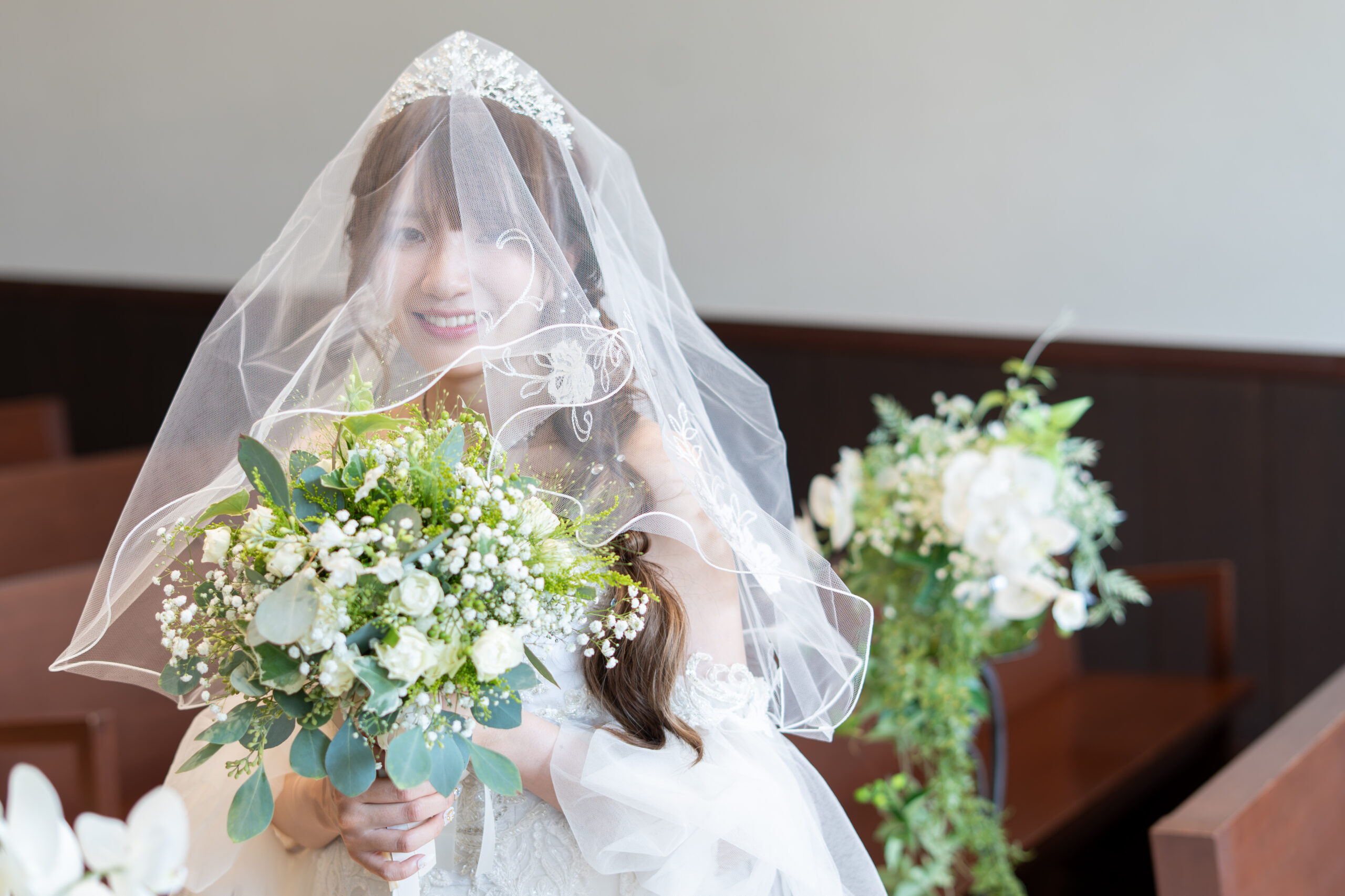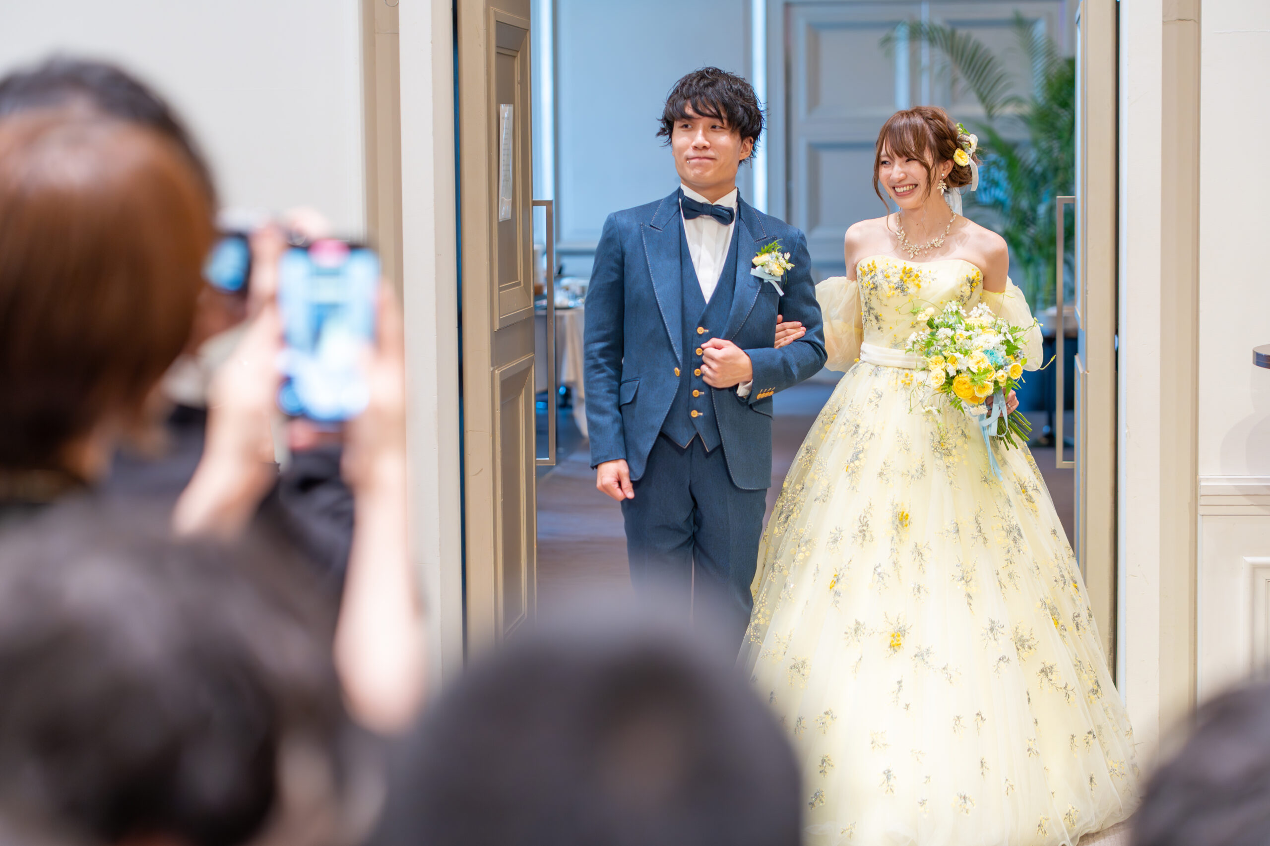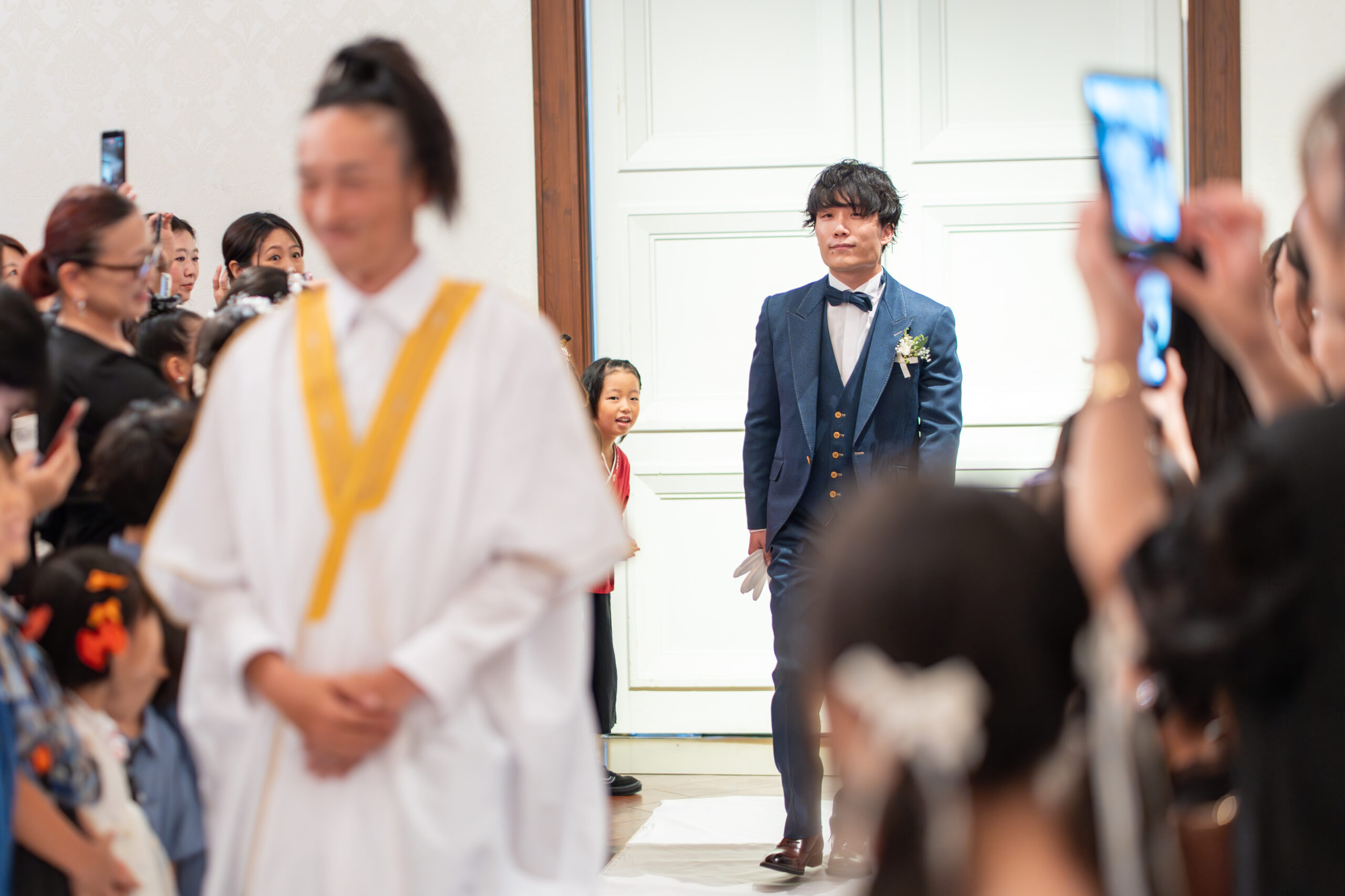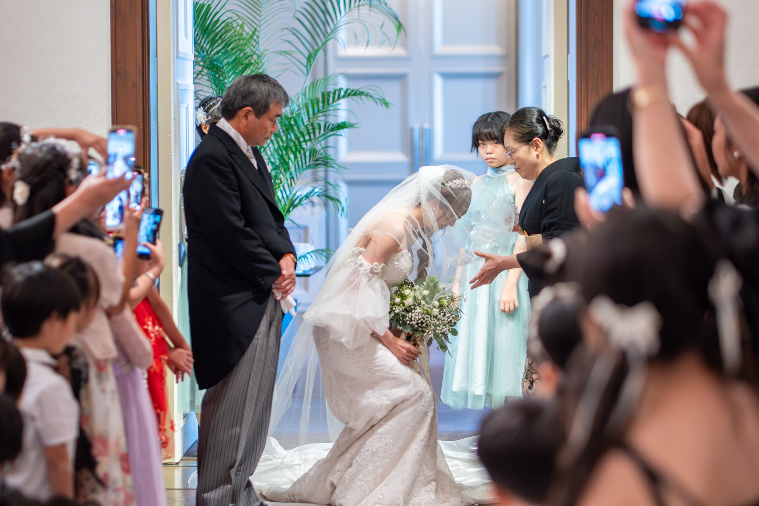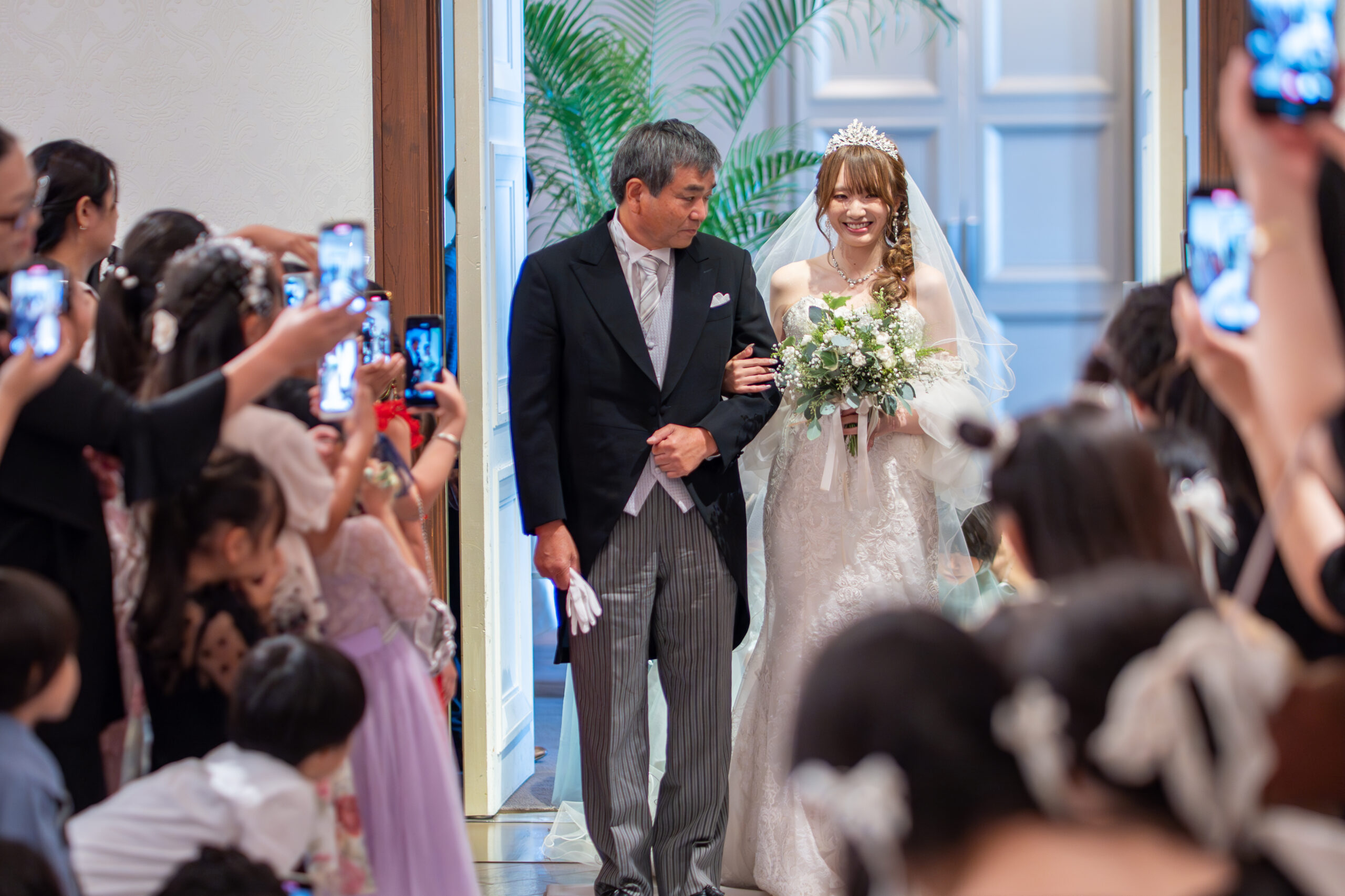 新婦様の入場はお母様からベールダウンセレモニー、お父様とバージンロードを歩みます。