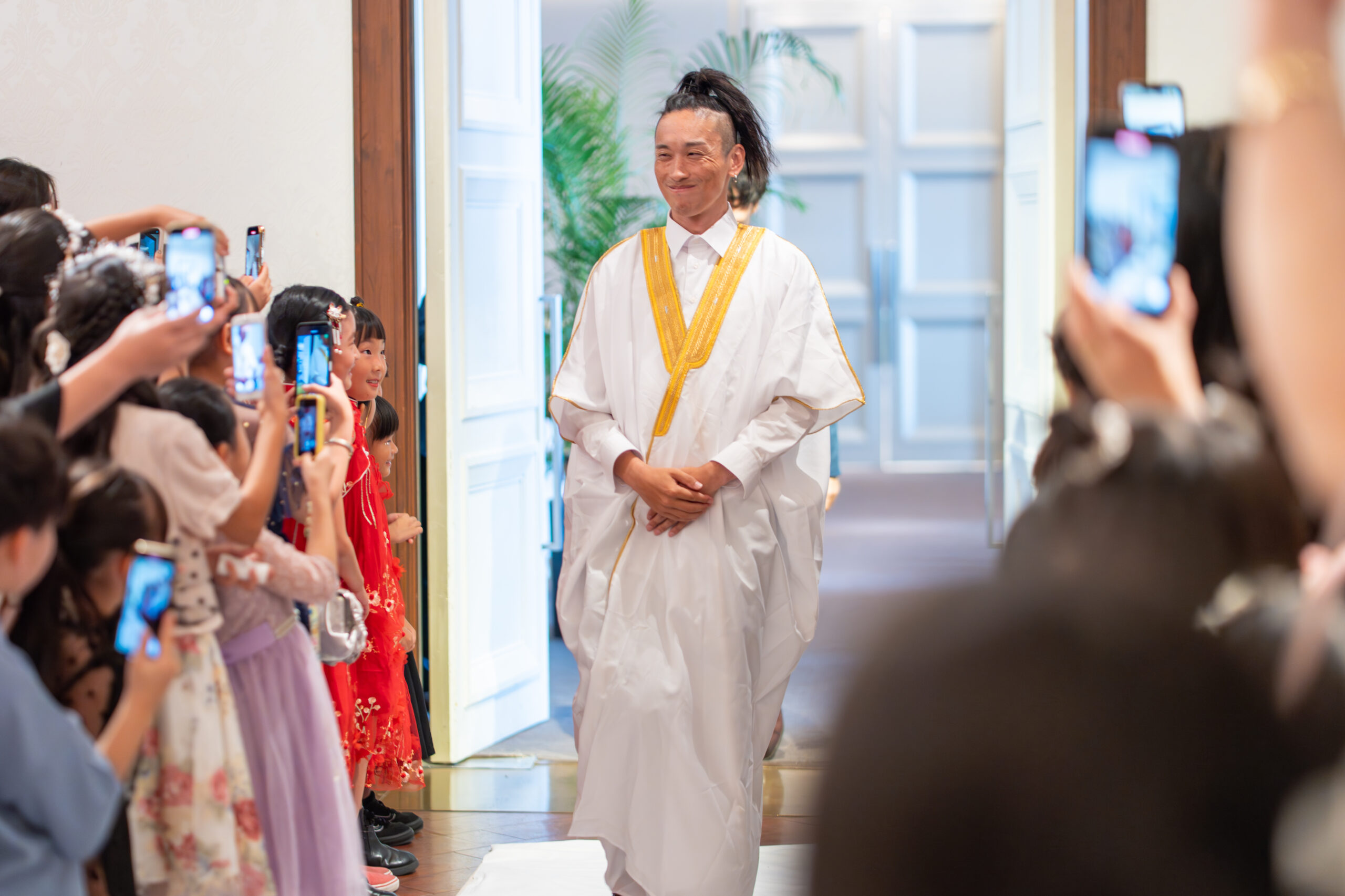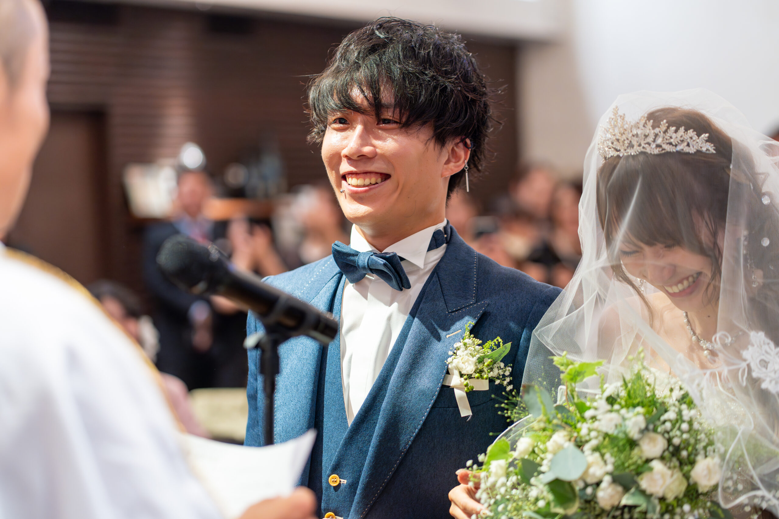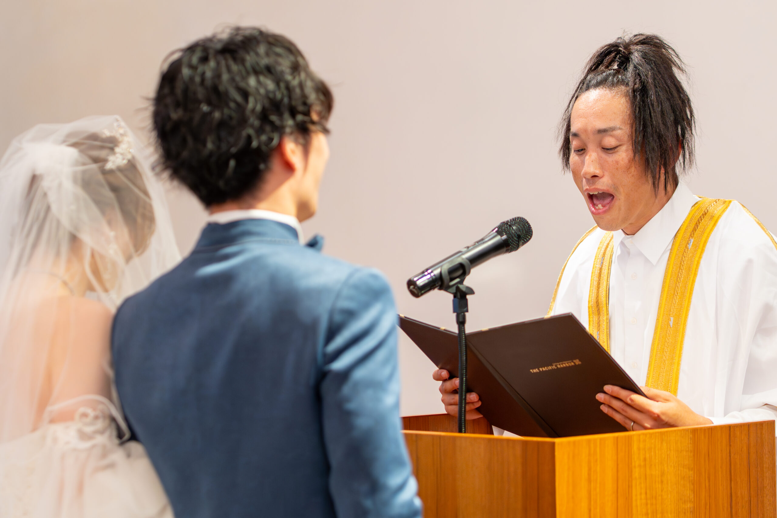 牧師がセレモニーをカタコトで進行するごとに会場からは笑みがこぼれます。