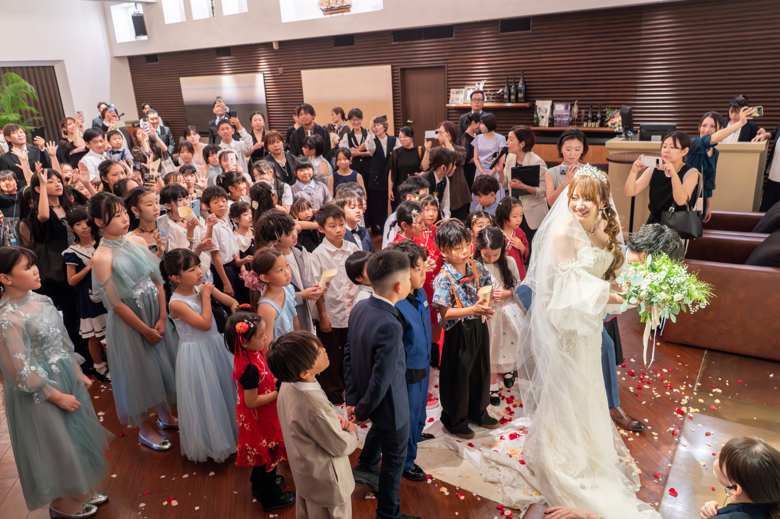 トスした瞬間に5つにシェア!ブーケを受け取ったお子様は大喜び♬